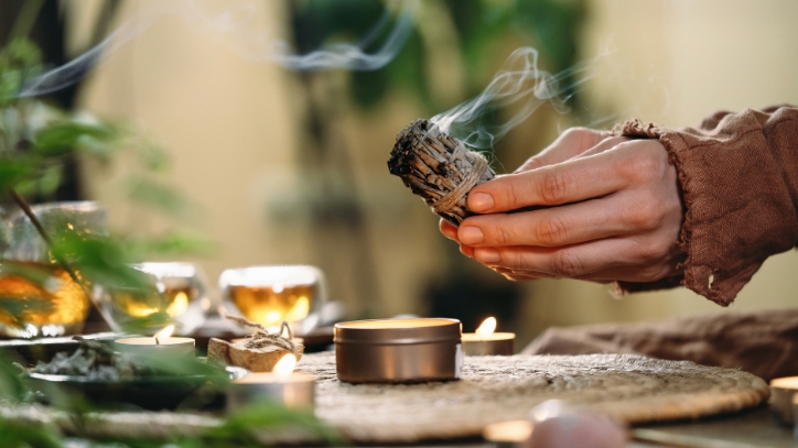 El sahumado es un ritual ancestral practicado en muchas culturas desde tiempos inmemoriales. Para ello puedes utilizar hierbas como salvia blanca, palo santo, copal o romero seco.