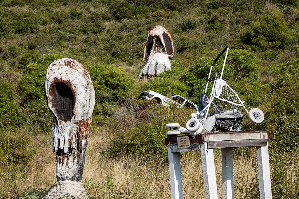Dos de ellos están enfrentados, congelados en un choque frontal eterno. Otro se eleva sobre una plataforma oxidada, y junto a él, una silleta infantil destrozada pone un nudo en la garganta de quien la observa. Grabado sobre una chapa, puede leerse un mensaje inquietante:
